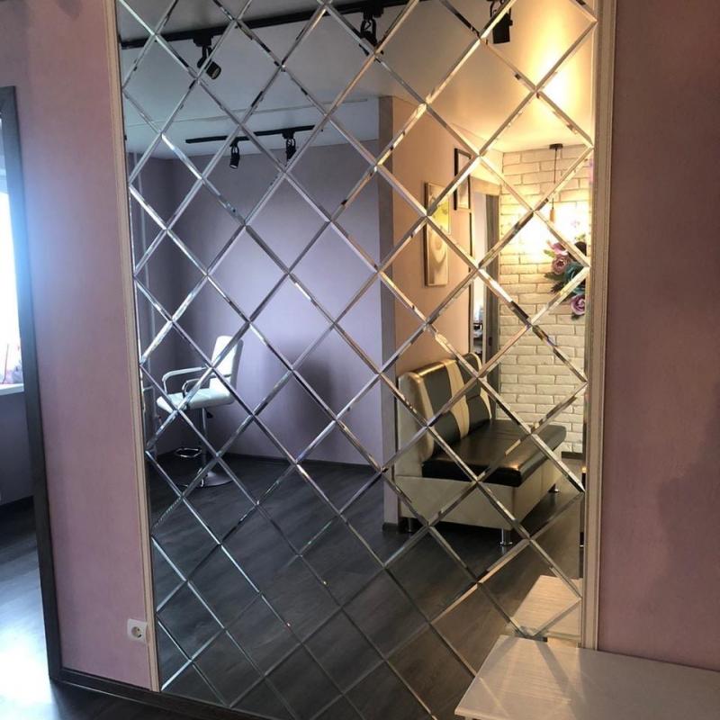 Зеркальное панно в салоне, Москва, серебряная глянцевая плитка квадратной формы